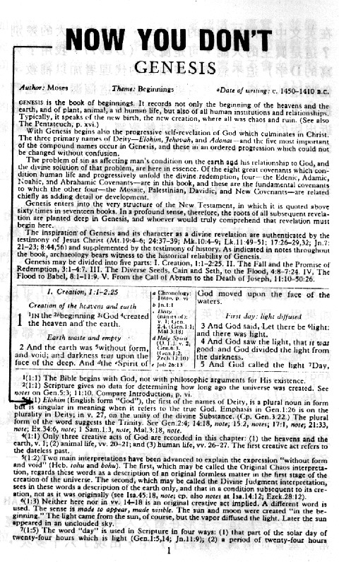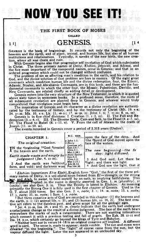 請注意,左邊他們的第一號註解:「Elohim,(有時作El或Elah,意指上帝)」有時拼作「A]ah」(第三行第三字)這上面八位神學博士不可能都瞎了眼重複地稱上帝為Alah。親愛的讀者,這個字在英文中和阿拉伯字的Allah,是否有很大的差別?這是真主的大能,可是魔鬼(Devil,我用了大寫的D字)迫不急待地經由他的代理者加以補救,他將這八名博士的大名剔除,認為這個漏子是他們插的,另外補上九名學位比他們更顯著的人,在最近出版的「最新史可非德註解聖經」(The New Scofield Reference Bible)中,你無論如何也找不到Alah這個字了。魔鬼已注意到這點。