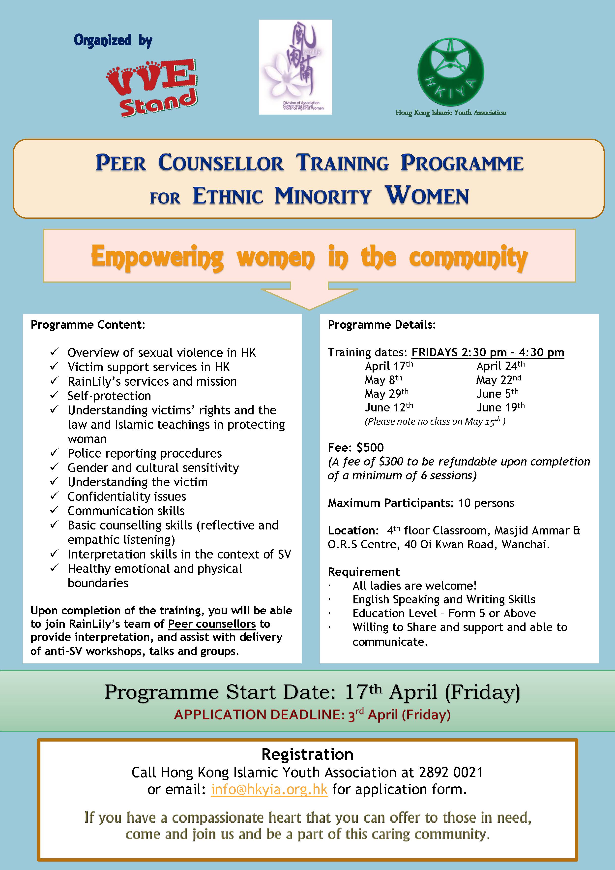 Hong Kong Islamic Youth Association (HKIYA) and Rainlily is jointly organizing a “Peer Counsellor Training Program for Women”.