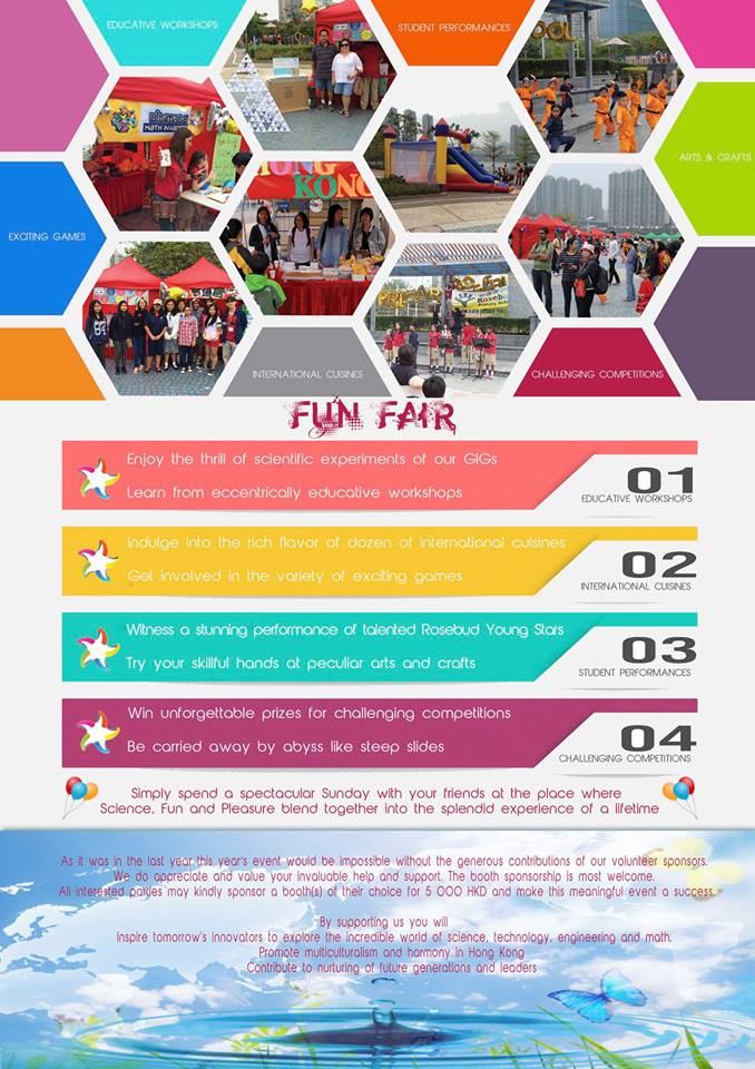 Rosebud Second Annual Fun Fair will be held on Sunday, 19th April, 2015 at Tsuen Wan Park.Fun Fair offers a host of events, games and activities when our teachers, students, parents, PTA, student council and alumni association work together to make it a memorable day of games, fun, and collaboration.