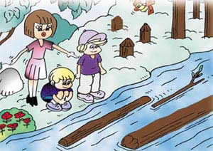 跟著來的幾天,卡里姆、哥哥和姊姊都一同往河岸那裏去,他們變得愈來愈好奇,因為每天他們都發現有更多的樹被砍掉,掉到水裏去。還有,樹幹似乎是被仔細地從樹分割開的,並且刻意地被堆砌起來。河水的聲響現在被抑制得低沉下來,並且一個小池塘開始形成了。卡里姆