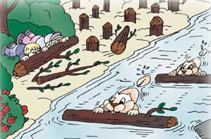 然後另一隻河狸來了並開始啃咬另一棵樹,這棵樹也是直接地,掉到河上去。跟著另一棵,然後再另一棵,然後再另一棵...