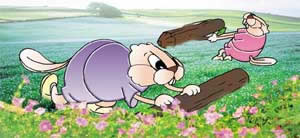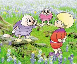 河狸先生向卡里姆解釋牠們如何將樹幹及樹枝利用河水運到目的地,而河狸太太將它們貼在一起。