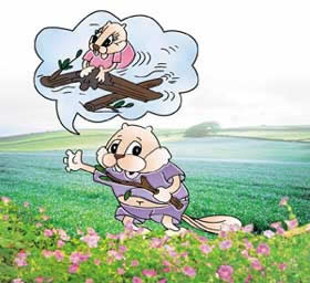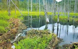 。但我們建造的水壩是非常堅固的,並且隨著時間一天比一天更有規模和更穩固。因為當水壩加高了,收集的水的水平線也比前上升。這樣在幾個月之後,一個由水壩截成的池塘便形成了。但是,當池塘擴大,我們必須注意加強和維修水壩的工作。正如河狸先生說,我們把樹幹之間的空隙填上泥和灌木。可是,還有一件非常重要的事情。您有沒有注意到我們水壩的形狀?它看起來像一把弓,不是嗎?它是凹面向內彎曲的。所有河狸水壩都是建築成凹面向內彎曲的。我們要以45度角來攔截河水。」