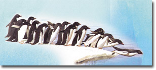 天的時間,寸步不離地執行這項工作。與此同時,企鵝媽媽要離開,為將出生的嬰孩尋找食物。在牠出生之後,小企鵝在爸媽的腳上度過牠的第一個月。如果牠們離開那裡,即使只是二分鐘這樣短暫的時間,牠們都會凍死。」