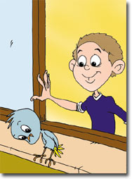 和鳥交談時,他的媽媽吩咐他回房間裏做功課。同時,雨也停下來了。