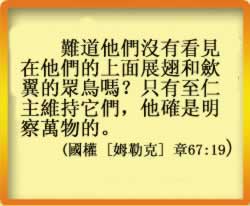 難道他們沒有看見在空中被制服的群鳥嗎?只有真主維持他們;對於信道的民眾,此中確有許多蹟象。