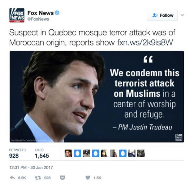 另外,一些媒體也沒有盡到更正準確消息的義務。在1月30日中午12點05分,魁北克警方發佈推文稱一名被逮捕的嫌犯被查明是證人,兇手只有一人。在這則消息浮出水面後,大部分主流媒體都在更新他們先前的報導。然而偏右翼的福克斯新聞卻發佈了新的推文散佈“報導稱被逮捕的疑犯是摩洛哥人”這一未被證實且顯然已經過時的消息。
