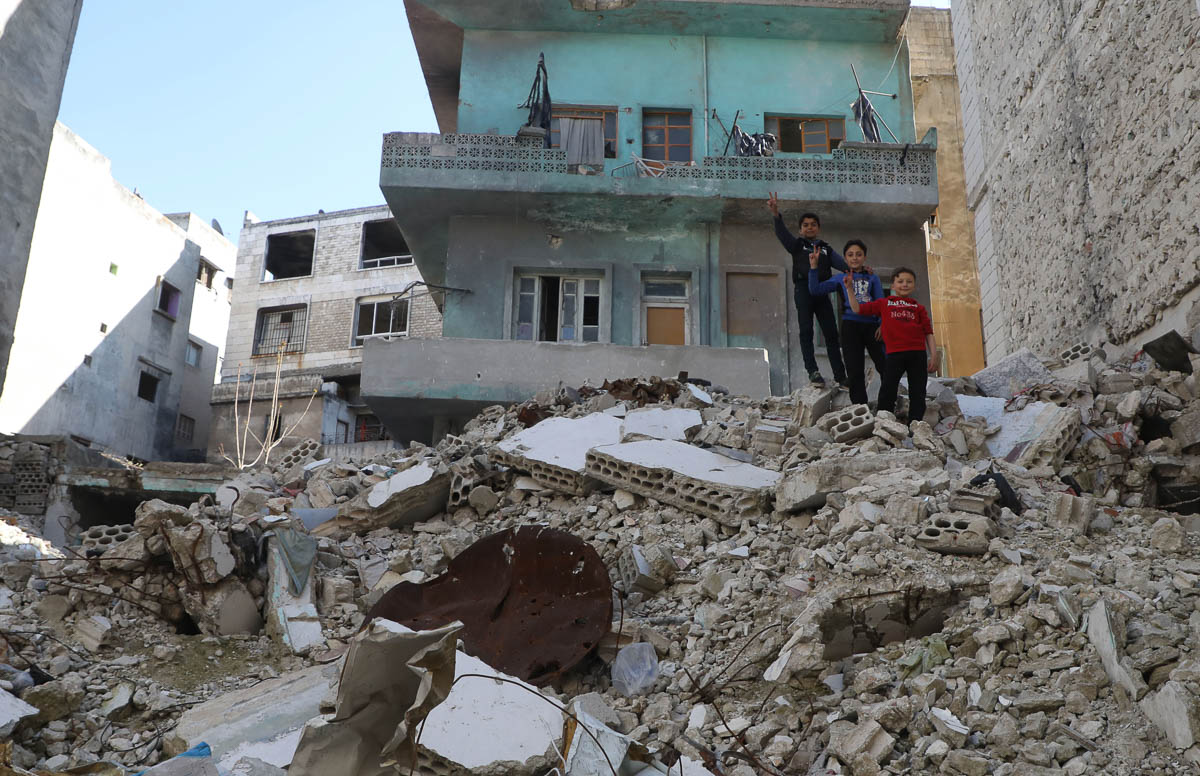阿布•齊亞德的三個孩子站在已經化為廢墟的家中合影留念。新冠肺炎病毒爆發以來,不少從伊德利蔔省逃往其他國家或地區的難民都選擇回到家鄉,因為他們擔心難民營糟糕的環境會加大感染的風險。