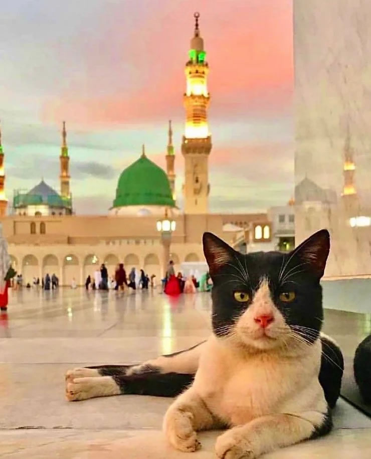 麥加禁寺的貓。一隻貓可以在伊斯蘭最神聖的天房附近活動,這也反映了先知穆罕默德(願主福安之)的穩麥對貓的喜愛。