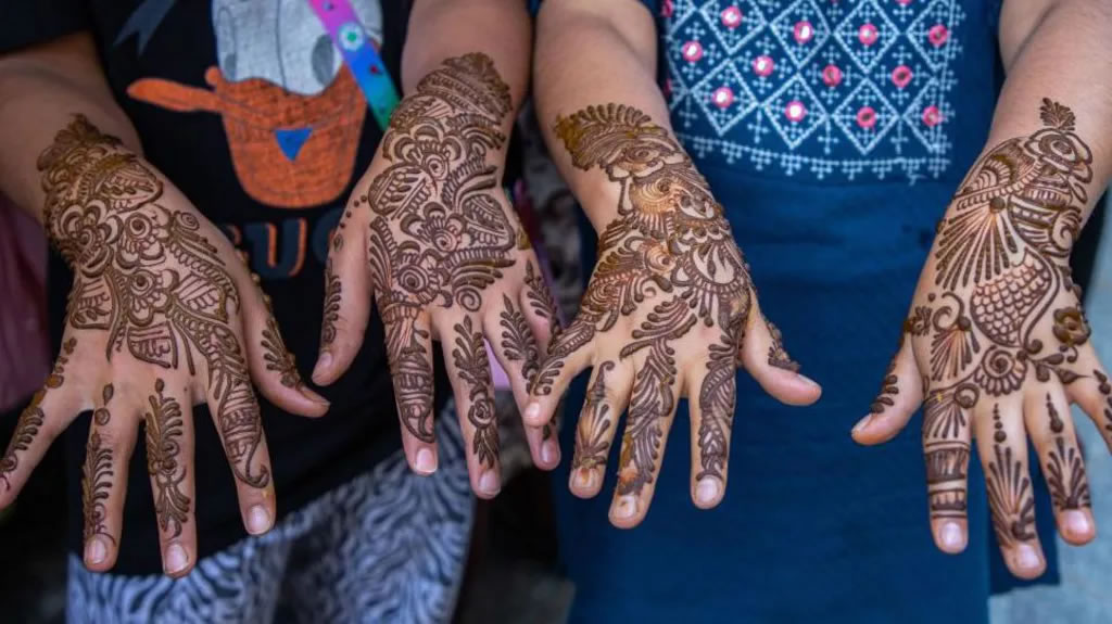 喀什米爾首府斯利那加,穆斯林女孩在宰牲節慶祝活動前展示用海娜裝飾的雙手