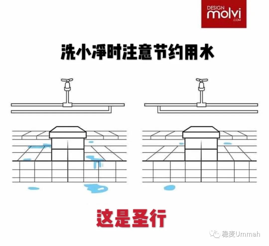 穆聖ﷺ既強調大小淨的重要性,同時很注意節約用水。穆聖ﷺ曾見一位聖門弟子做小淨有些浪費,當場制止且說河邊做小淨也不能多用水。伊斯蘭這種既講究清潔衛生,又注意節約用水的優良傳統,應該大力發揚光大。特別是在人類進入現代社會,清潔衛生已成習慣,水資源越來越匱乏的今天,更應該厲行節約用水,大力反對浪費水的不良現象。——《穆斯林聖訓實錄全集》
