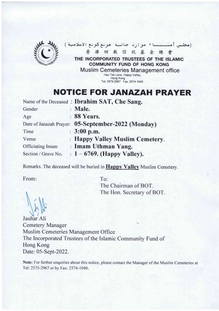 2022年9月5日,下午3點,香港伊斯蘭教六團體(香港中華回教博愛社、香港中國回教協會、香港伊斯蘭聯會、香港回教信託基金總會、香港回教婦女會、香港伊斯蘭青年會)為老人家舉行殯禮,殯禮後,埋依台將安葬於跑馬地回教墳場。