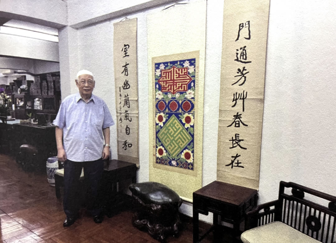 傳統華人穆斯林家庭懸掛阿拉伯經文與中國書法結合的中堂,圖中人物為香港華人穆斯林收藏家、文博專家黑洪祿先生