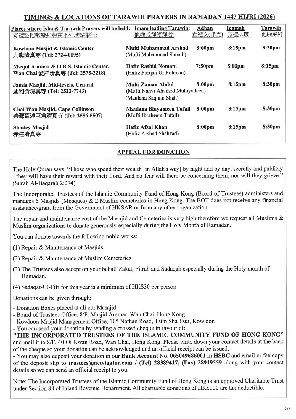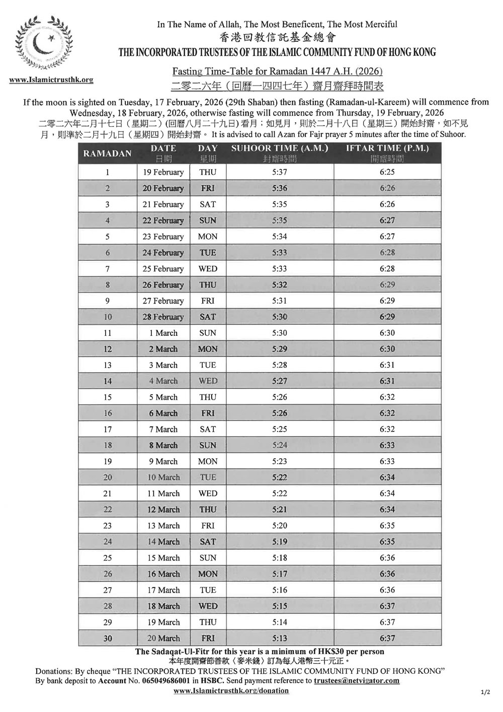 齋月齋拜時間表(2026/1447)