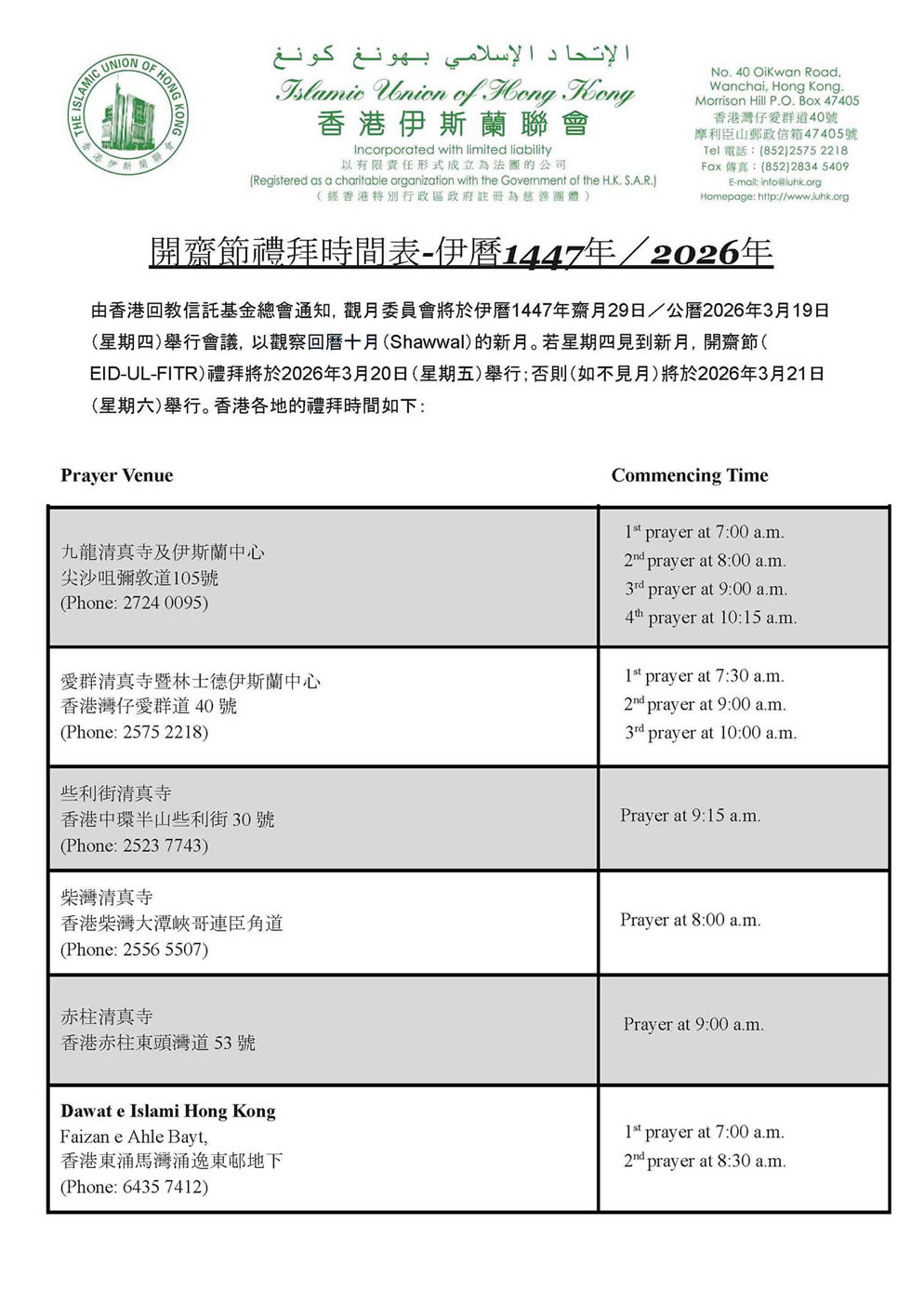 開齋節禮拜時聞表(伊曆1447年/2026年)