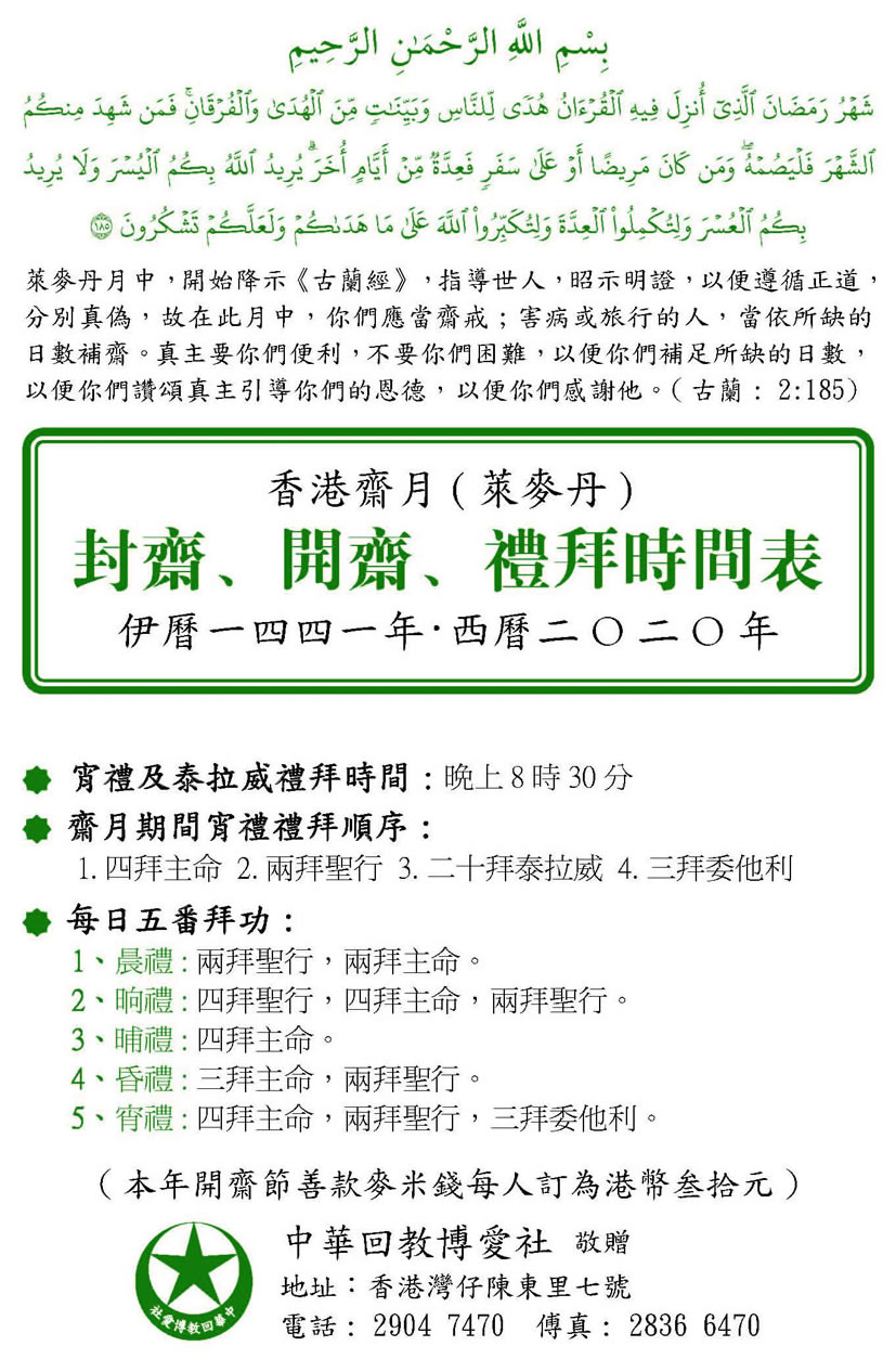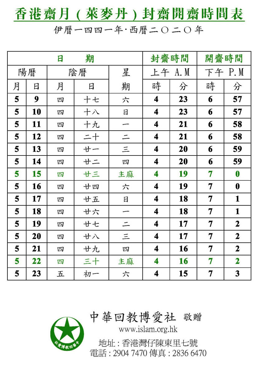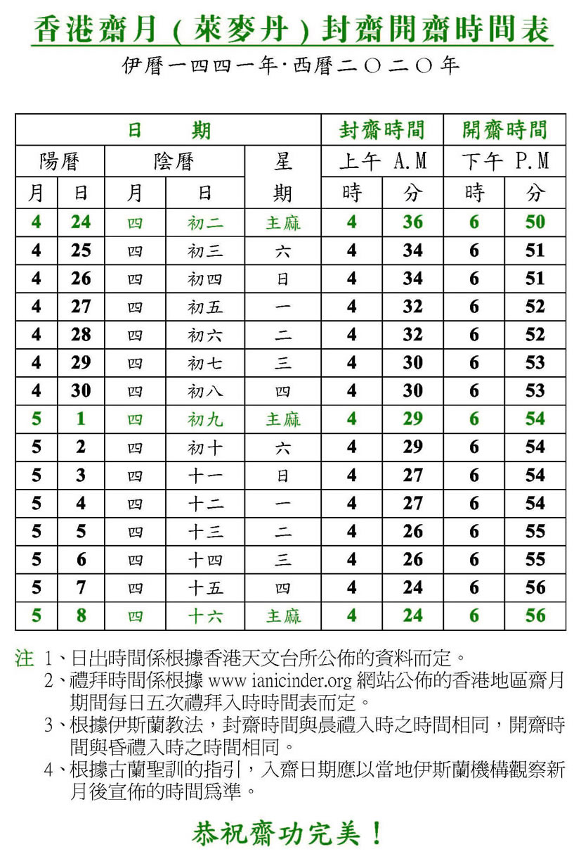 香港齋月封齋、開齋、禮拜時間表