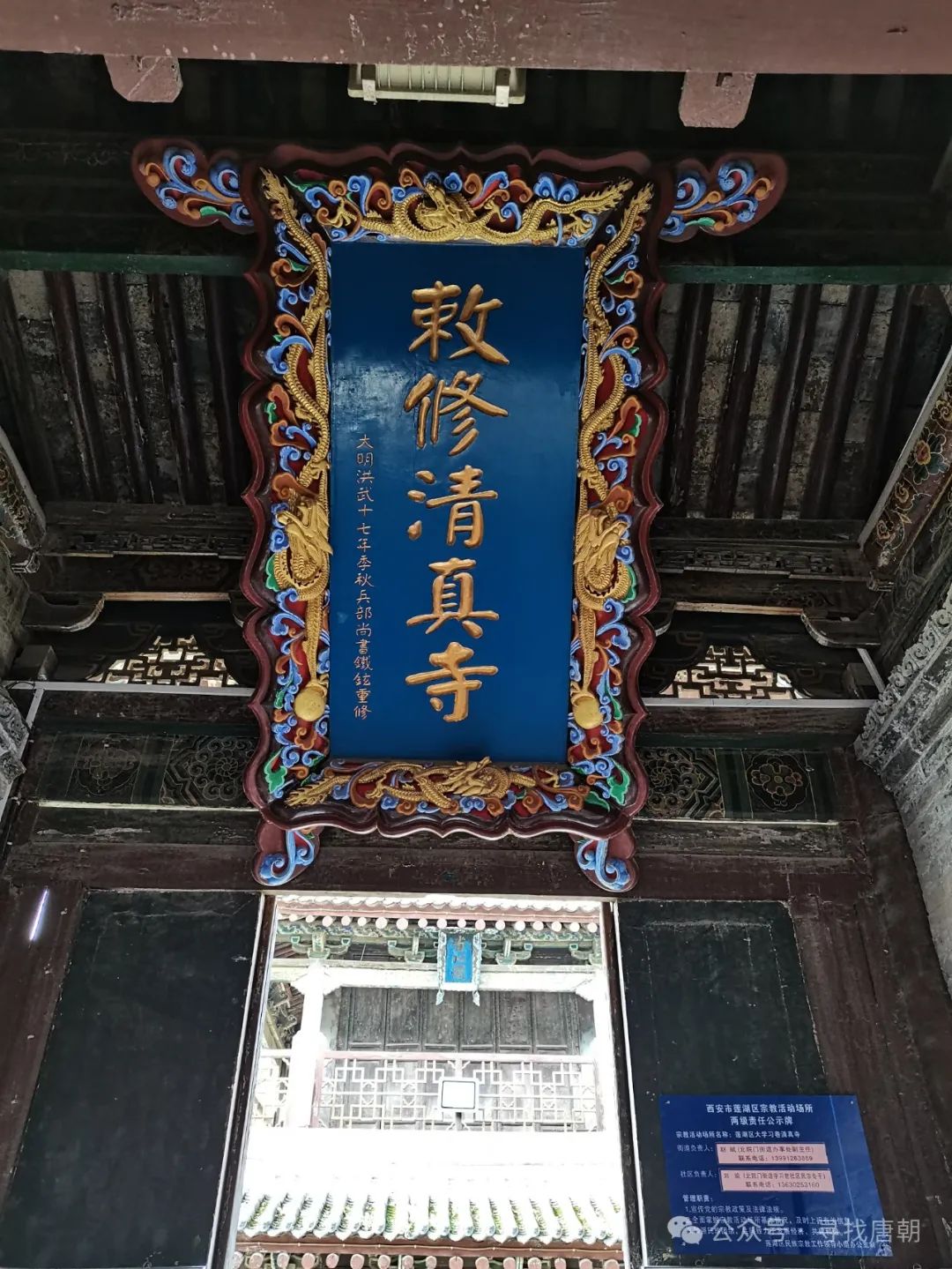 寺中現存明天啟六年(1626年)的《敕賜清真寺碑記》是最重要的文獻,其中詳細記載了該寺數次敕賜的過程,明確寫道:“古長安新興坊有清真寺”,“在唐中宗時,已賜名清教寺;在玄宗朝,複敕改唐明寺;在元中統間,又賜名回回萬善寺。”明洪武十七年(1384年)又敕賜“清真寺”。該碑記由當時的關中大儒馮從吾親自撰寫。