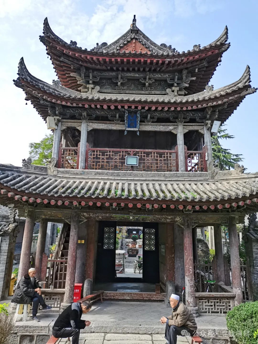 該寺大門為藍色琉璃瓦頂,三間廳,懸掛有兩塊匾,其中“敕修清真寺”匾落款為“大明洪武十七年兵部尚書鐵鉉重修”。進一進院,迎面便是古香古色的省心閣。相傳省心閣建于宋代,明朝鄭和四下西洋回來後重修清真寺時複修,後經多次修葺,仍保持原貌至今。省心閣為四角形樓式建築,三層三重簷,佈局莊嚴古雅,現經彩繪,映翠飛丹,玲瓏絢麗,為寺內主要建築之一。一進院北側為兩層三開間古建閣樓,雕廊畫棟;南側有空地,通過側門與街道相連。省心閣兩側各有磚砌的立門和月亮門兩座,兩座立門門樓的磚雕精美。
