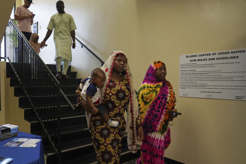 如今,当地穆斯林改在1970年代建成的锡达拉皮兹伊斯兰中心进行聚礼或聚会。早年“母亲清真寺”的祈祷室只有客厅大小,早已容纳不下太多人。如今,即便是这座更大的伊斯兰中心,也同样显得拥挤。数百名第五代的爱荷华穆斯林,以及新来的难民和移民,只能在篮球馆的地板上铺上地毯礼拜:有人年迈拄着助行器,有人抱着婴儿安置在安全座椅里,妇女头戴头巾,男子们则或戴非洲的库菲帽,或戴阿富汗的帕科尔帽,甚至有人干脆戴着棒球帽。