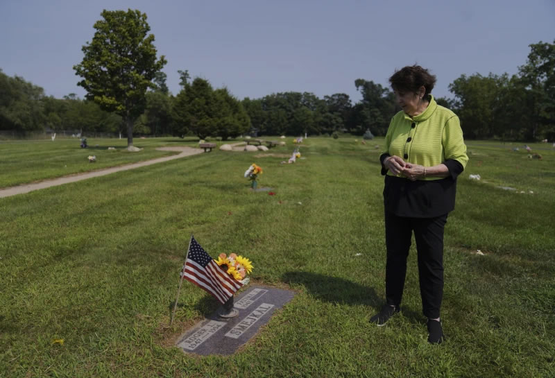 法蒂玛·伊格拉姆·斯梅伊卡尔站在丈夫的墓前