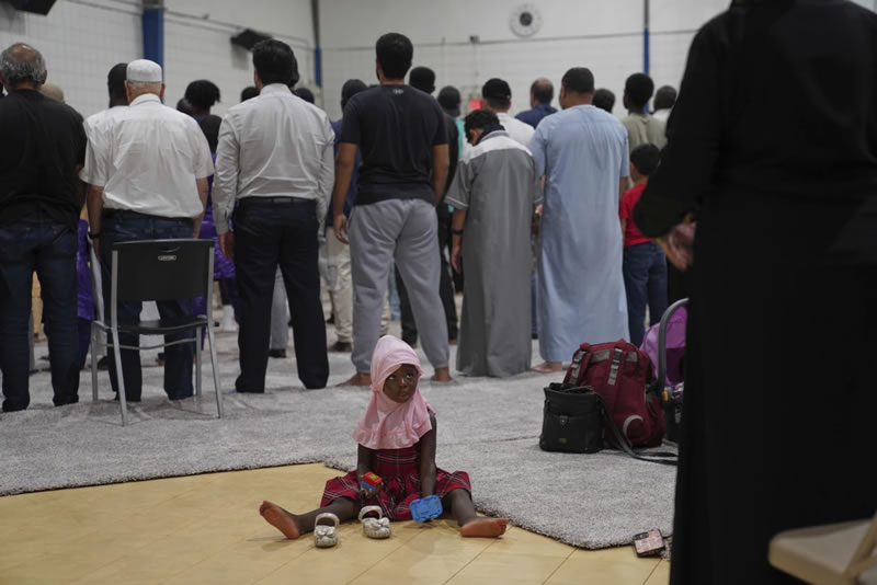 一个小女孩注视着人们在锡达拉皮兹伊斯兰中心礼拜