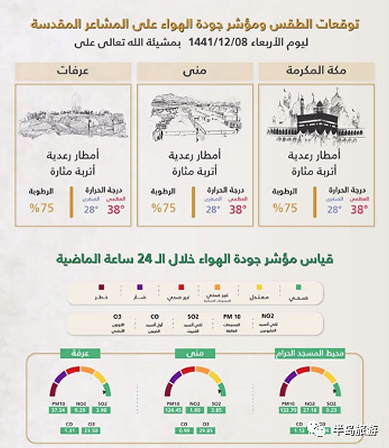 麥加市區:有雷陣雨和揚塵,最高氣溫38°,最低溫度28°,濕度:75%