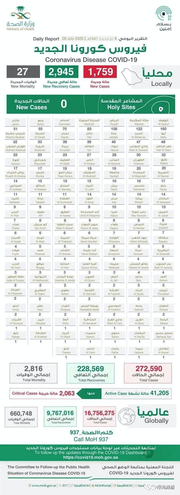 沙特衛生部宣佈,截止7.29日,沙特境內過去24小時新增確診病例1759例,新增治癒病例2954例,新增死亡病例27例,截至目前,沙特境內已累計確診病例超過27.2萬例,累計治癒達到22.8萬例,累計死亡2816例。目前還有活躍病例4萬多例,其中2063例為重症病例。