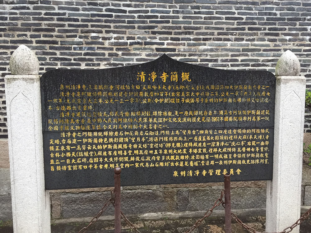 清淨寺,初名聖友寺,又稱艾蘇哈蔔大清真寺,位於福建省泉州市區塗門街,是阿拉伯穆斯林在中國創建的現存最古老的伊斯蘭教寺,始建于北宋大中祥符二年(西元1009年),是年為回曆400年。清淨寺占地面積2184平方米,整體為石構建築,仿照敘利亞大馬士革伊斯蘭教禮拜堂的建築形式,具有伊斯蘭教清真寺在功能空間上大分散、小集中特點。留存主要建築為門樓、禮拜殿、明善堂等部分。1961年,清淨寺被國務院列為首批全國重點文物保護單位,20世紀90年代列為“中國十大名寺”中唯一入選的伊斯蘭教清真寺。與揚州仙鶴寺、廣州懷聖寺、杭州鳳凰寺合稱中國伊斯蘭教四大古寺,它的建立是泉州海外交流重要史跡之一。