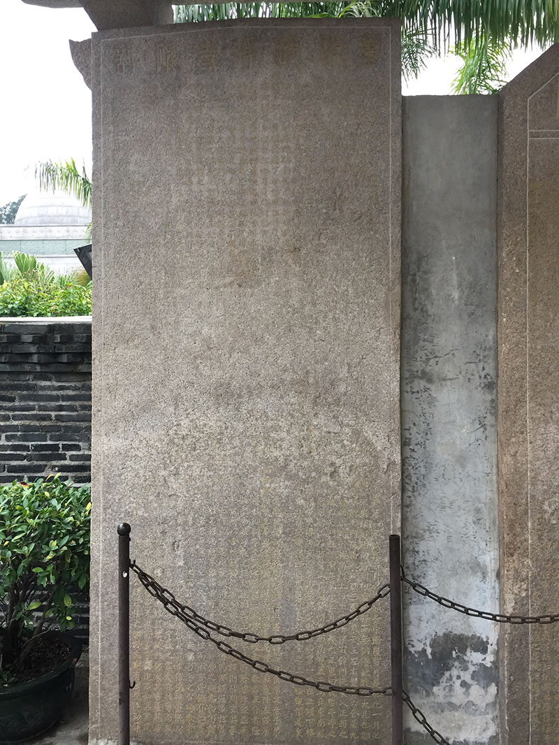明善堂大門上額,懸掛廈門關監督唐柯三於民國十一年(1922年)題寫橫匾“認主獨一”。大門內上端掛著一匾額,亦是唐柯三調任山東濟南道道尹後,於民國十三年(1924年)六月敬立的,文曰“三畏四箴”。從伊斯蘭教義解釋,三畏即“畏天命、畏聖言、畏末日”,四箴即“箴信真主安拉、箴順先知穆罕默德聖人、箴遵天經《古蘭經》、箴行五功”。