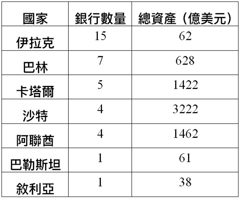 伊斯蘭銀行在阿拉伯國家銀行總資產中所占的比例各不相同。蘇丹的比例最高,達到100%,其次是沙烏地阿拉伯的74.9%、科威特的51%、卡塔爾的28.6%、吉布地的25.0%、阿聯酋的22.7%、約旦的17.8%、巴勒斯坦的17.4%、阿曼的16.6% 和巴林的16.1%。