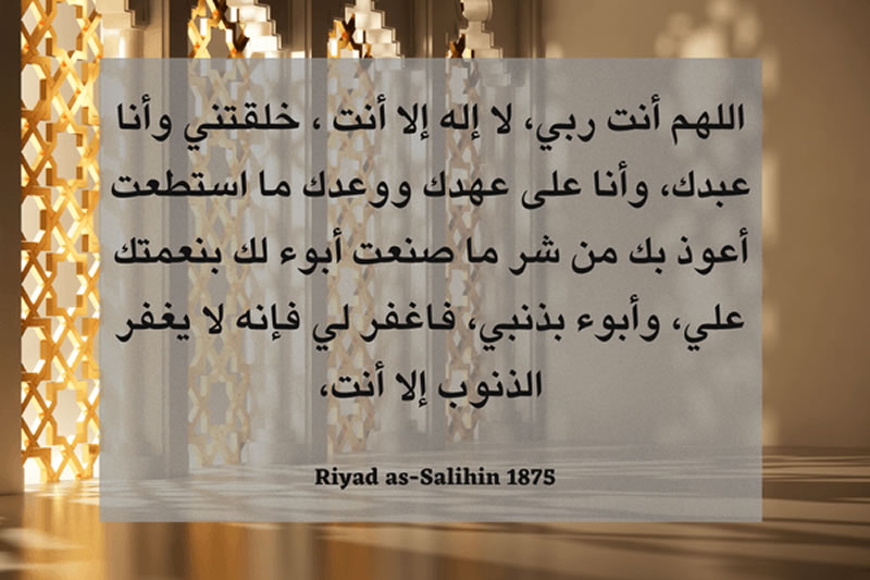 翻譯: “真主啊!你是我的養主,除你之外再無主宰。你創造了我,我是你的僕民,我盡我所能忠於與你的契約與承諾,我尋求你的庇護,免遭我所作惡行的傷害;我承認你賜予我的恩惠,並承認自己的罪過,因此,請你赦免我吧!因為除你之外,無人能寬恕罪過。”《利雅德聖訓集》