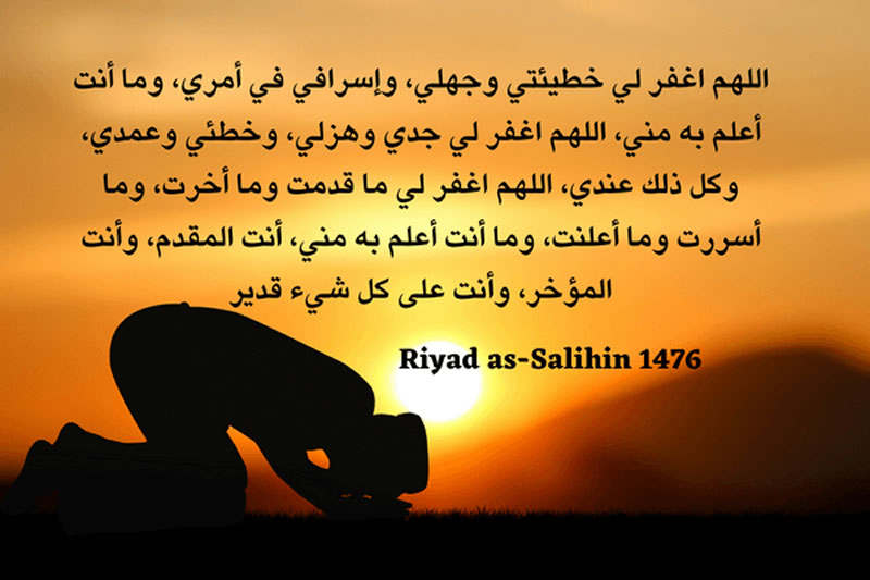 翻譯: “真主啊!請你寬恕我的錯誤、我的無知和我過度的行為,因為你比我更瞭解我的過錯。真主啊!請你赦免我那些有意或無意犯下的罪過,那些我有意或無意做過的事情。真主啊!請你寬恕我過去的罪,以及我將來可能犯下的罪,那些我在公開或私下所做的罪,以及你比我更清楚的一切罪過。唯有你能讓人進入樂園,唯有你能讓人進入火獄,你是全能的。”《利雅德聖訓集》