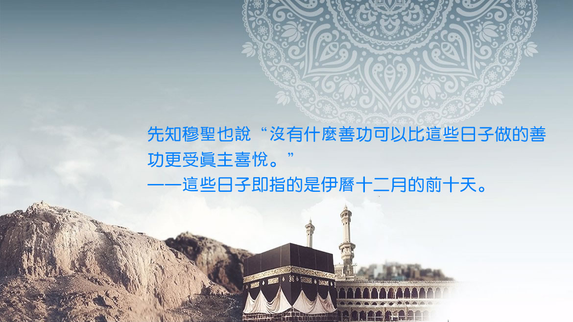 據歐麥爾傳述說,穆聖先知說:“沒有什麼日子內的善功,比起伊曆十月前十天的善功更為真主所喜悅。所以,你們要多贊念真主尊名,多誦念真主至大,多感謝真主!”(艾哈邁德傳述)