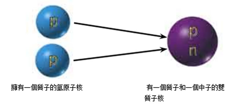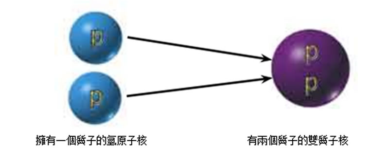 正如在紅色巨星上發生的那樣, 太陽內部的核反應也是意 想不到的一個工序° 任意旋轉的四個氫原子碰到一塊形成氦原 子是不可能的° 因此, 如同在紅色巨星上發生的那樣, 它的形成 有兩道工序° 首先兩個氫原子結合到一起形成一個擁有一個質子和一個中子的 “過渡結構” ° 這個過渡結構被稱作為 “ 重氫核°”