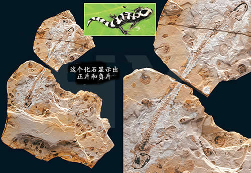 圖中的火蜥蜴化石有2.08億到到6500萬年的歷史,它們在百萬年間都沒有發生變化。火蜥蜴化石和現代的火蜥蜴在結構上沒有區別,這就證明了進化論者提出的進化過程根本沒有發生。 |