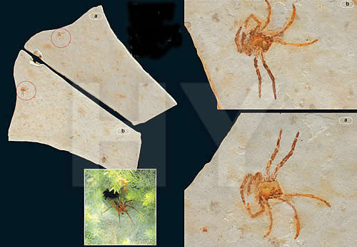已知最古老的蜘蛛化石是一隻水蜘蛛,它生活在4.25億年前。圖中的化石有1.56億到1.5億年歷史,這些化石顯示了蜘蛛在數億年的時間裏一直保持不變,進化論者對此無法做出合理的科學解釋。 |