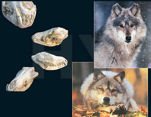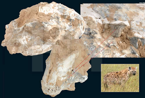 圖中的土狼頭骨的年齡在1000萬到500萬年之間,這證明了百萬年間,土狼沒有任何變化。 |