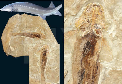 化石表明,魚和其他綱的生物一樣都是突然出現的,出現時就已經具有了它們現有的結構和完美的解剖學特徵。這件年齡在1.46億年到6500萬年之間的鱘魚化石與現代的鱘魚沒有什麽不同就是例子。 |