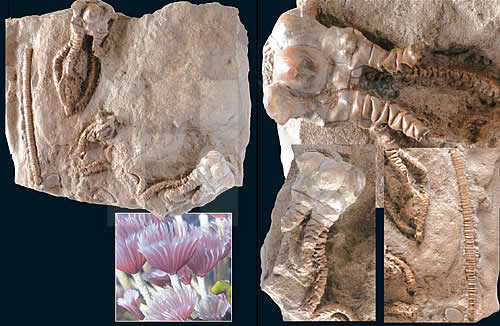 圖中的海百合化石是無數個在澳大利亞發現的海百合化石中的一個例子。這只2.65億年前的海百合和今天的海百合沒有區別,這證明了海百合從來沒有發生進化。 |