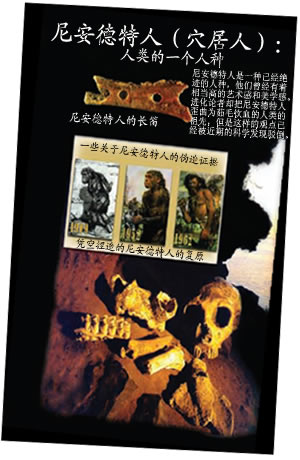尼安德特人(Neanderthals)是十萬多年前出現在歐洲大陸的人類,之後大約于三萬五千年前絕迹——或者也有可能被其他種族吸收融合了。他們和現代人的主要區別是他們的骨骼更加粗壯,而且他們的頭骨平均都比現代人大一些。科學發現指出,尼安德特人是一個完全的人類種族,他們的智力水準和文化修養和我們並無二致。克魯馬努人(Cro-Magnon)也是被認爲是生活在三萬年前的人種。他們的頭骨呈圓頂狀,前額寬大。他們的頭骨體積爲1600立方米,大大超過了現代人的平均值。他們的眉骨粗大,高高地凸出在頭骨上,而且頭骨的背後也有凸骨,這些也都是尼安德特人的特徵。