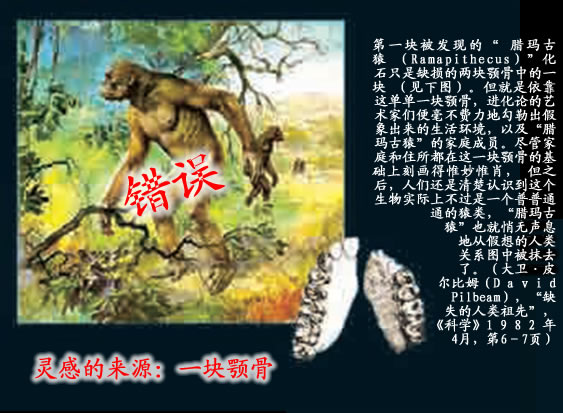 3.“臘瑪古猿(Ramapithecus)”是進化理論造假事件中最大的也是歷時最久的一例。該名稱被所指的是於一九三二年在印度發現的化石,被認爲是人類和猿類分離的第一個階段,應追溯到一千四百年前。在五十多年中,該化石曾一直被進化論者認爲是不可動搖的鐵證。然而,在進行進一步分析的過程中,卻發現“臘瑪古猿”的牙齒特徵很接近現今仍存活的黑猩猩。例如“獅尾狒(Theropithecus galada)”,一種生活在衣索比亞高海拔地區的狒狒,擁有門齒和犬齒,但比現存的猿類的要小,和“臘瑪古猿”一樣臉較短。一九八二年四月的《科學》中有一篇題爲“缺失的人類祖先”的文章,提出“臘瑪古猿”只不過是已經絕迹的一種猩猩而已。