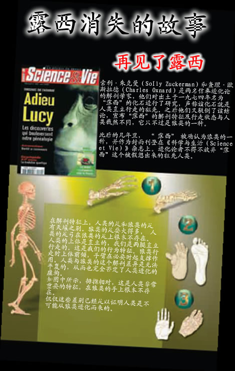 5. “露西(Lucy)”是給一塊化石起的名字,該化石是由人類學家唐納德·喬安森(Donald Johanson)於一九七四年發現的。衆多進化論者揚言露西是人類與及其所謂的原是人類的過渡形式。然而,在對化石進行進一步分析的過程中,發現露西只是已經絕迹了的一種猿類,名叫“南方古猿(Australopithecus)”。“南方古猿”的腦量與黑猩猩相類似。許多其他的特徵——諸如頭骨的細部、眼睛的間距、鋒利的臼齒、顎骨的結構、長臂短腿等等——所有這一切都足以證明了這類生物與現代黑猩猩並無二致。就連骨盆也與黑猩猩相仿。5