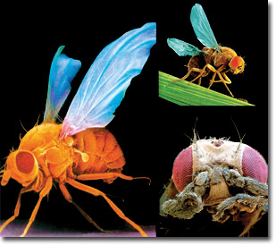 進入二十世紀以來,進化論生物學家試圖通過創造突變型蠅類,來尋求有益的突變。但這些努力導致了病態和畸形的生物。上左圖顯示了正常果蠅的頭部,下右圖顯示了腿從頭部伸出的果蠅的頭部。上右圖顯示了有畸形翅膀的果蠅,這些都是突變的結果。 |