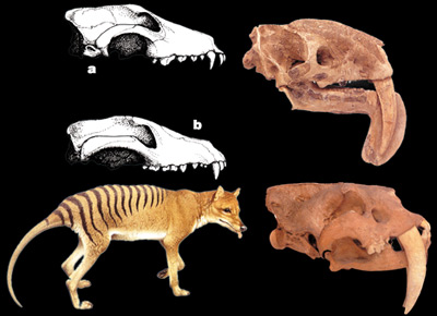 另一個胎生和有袋哺乳動物“雙胞胎”之間非常相似的例子,就是滅絕的哺乳動物劍齒虎(下圖)和袋劍虎(上圖),這兩種動物都用巨大的前齒捕食。它們的頭骨和牙齒結構有著極大的相似性,而它們之間是不能建立任何進化關係的,這推翻了相似結構是進化證據的同源觀點。