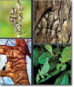 一隻藏身於樹枝中的蜥蜴(上左),一隻隱蔽在樹幹上的飛蛾(上右),一隻在樹枝上的貓頭鷹(下左),一群藏身於樹葉中的螳螂(下右)。 |