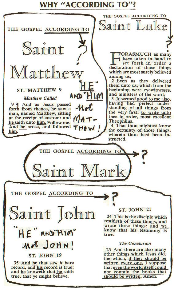 基督徒自誇,他們從四千多種不同的抄本中,挑選了符合他們偏見的四種,稱它們為馬太、馬可、路加,及約翰福音,讓我們看一看耶和華見證會,研究的結論。(原載於現被刪掉的前言中)