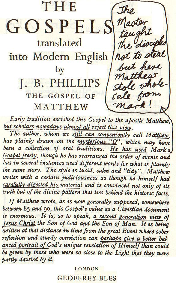 並不是我們單獨發現「馬太福音」不是馬太所寫,菲利浦斯(J.B. Phillips)也同意我們的發現,它是出自幾個無名氏之手,他是英國國教受薪人員,是英格蘭Chichester主教堂的受祿牧師,他沒有理由說謊或不忠其教會,做出有傷自己教會的官方觀點!