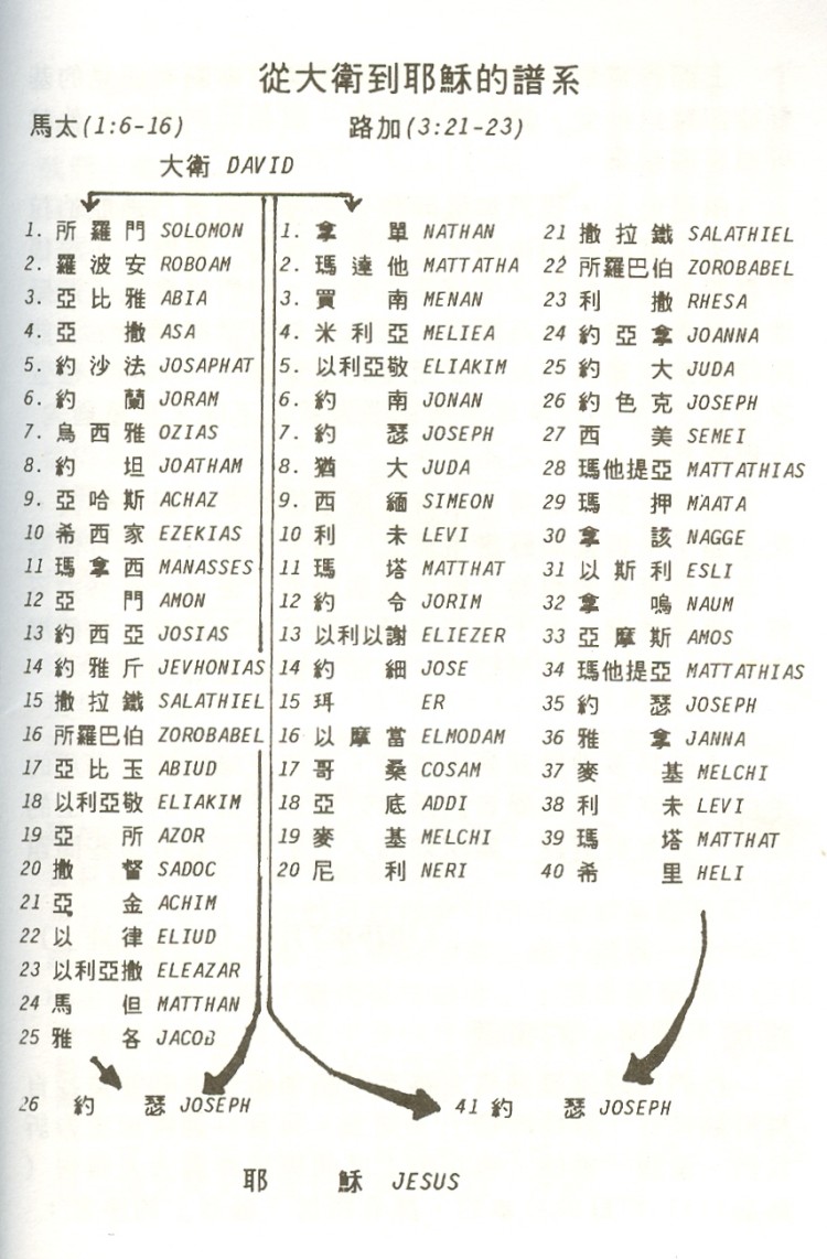 在四位福音著者當中,上帝僅僅「靈啟」兩位來記錄祂「兒子」(?)的家譜,為了方便讀者對照起見,我摘錄成一個表,只取姓名,省掉冗辭,在大衛和耶穌之間,上帝「靈啟」馬太,為祂的「兒子」寫了廿六位祖先,可是路加也受到「靈啟」,為耶穌收集了四十一位祖先,在這兩個表中,大衛和耶穌之間,唯一共同的名字就是約瑟,據路加說(3:23)他被信為(supposed)是耶穌的父親。