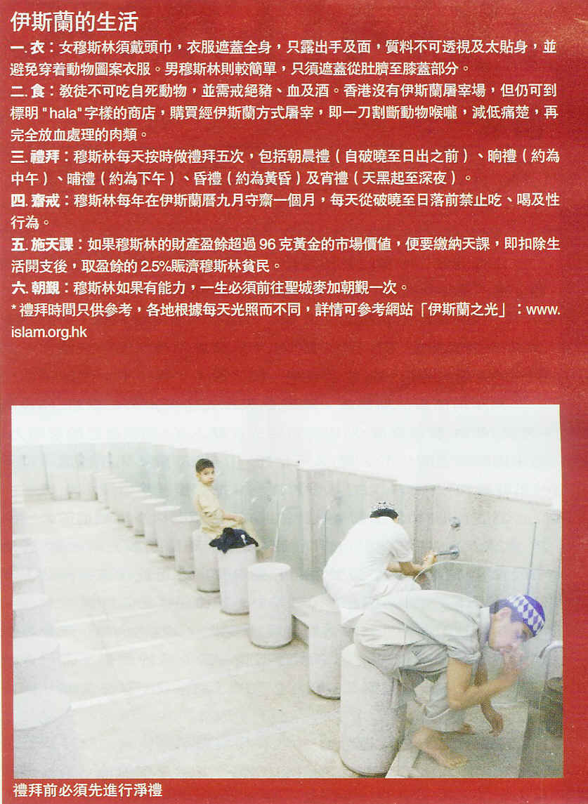 頂著一顆大桃頂的九龍清真寺,如巨人般屹立尖沙咀鬧市,絕大多數港人在它身邊穿梭往來,過其門而不入。 今天,就讓清真寺管的理人 Khamwja 帶領我們深入寺內,看看內堸悟[....... 進入清真寺,得先脫鞋。要急不及待深入主禮拜殿?且慢!先得進行淨禮,淨禮包括洗淨口、鼻、臉、手掌至手肘、腳至足踝及抹頭、頸、耳背,次數步驟都有規定。 乖乖地完成淨禮,終於來到二樓的禮拜殿,方方正正.的大殿鋪滿地毯,殿頂中央是一盞大水晶燈,陽光從幾何通花大理石牆身透射進來,形成一道道幻麗的光影。有人提著公事包而至,默默地做著連串鞠躬、叩頭、站立、跪下等禮拜指定動作,亦有人跪在大殿一角,喃喃地向真主禱告,氣氛莊嚴。 再上一層樓,原來更精彩。三樓是面積較小的禮拜殿,中央水晶燈連接兩層禮拜殿,大殿左右各有一扇門,步出,才發現另有天地。露天長廊以幾何形大理石點綴,四個角落各有一座細長的呼拜塔。清真寺管理人Khamwja 說, 「在香港,不可以用擴音器擴播(宣禮),呼拜塔已沒有實際用途,只是保留清真寺傳統建築特色。」從這堶蟋羉△韟璊H,對面的唐樓、食肆商店的招牌,更覺鬧市中的真寺像俗世清泉。 問 Khamwja,怎麼不見女信徒?原來她們自有天地,就在一樓。由於伊斯蘭教不鼓勵陌生男女接觸,因此清真寺大多分設男女禮拜殿。慢慢拾級步下,還未到一樓已聽見人聲鼎沸,原來聲音來自女禮拜殿旁教室,孩子們正在上《古蘭經》課,三數十名小童同時以阿拉伯文讀《古蘭經》。反觀女禮拜殿卻寧靜得很,有人低頭看書,有三五成群小聲談天,禮拜殿是女穆斯林交誼與禮拜的地方,男性絕對止步。