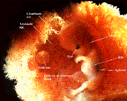 『母腹中的胚胎有三層暗壁保護著,它們是:1、腹壁;2、子宮壁;3、胎膜(見右圖示)。因為胚胎各階段的生長是十分復雜的,它持續地突變,所以可以運用《古蘭經》、《聖訓》中所提到的術語及其含意建立一套新的胚胎發展階段劃分法,新的體系更簡明、扼要,而且與現代對胚胎發展的新知吻合。 |